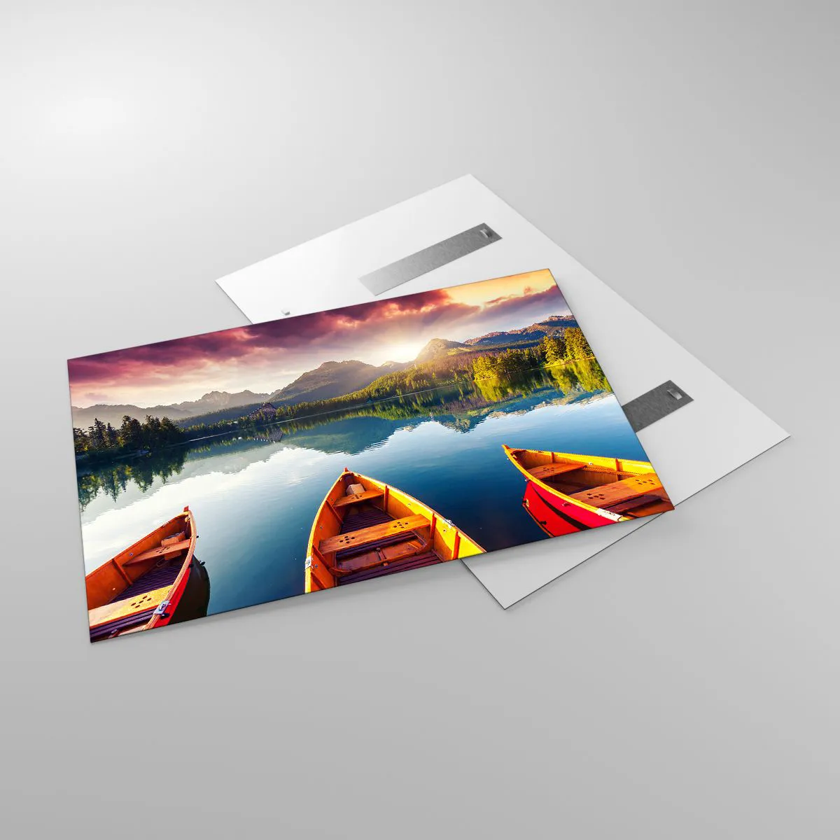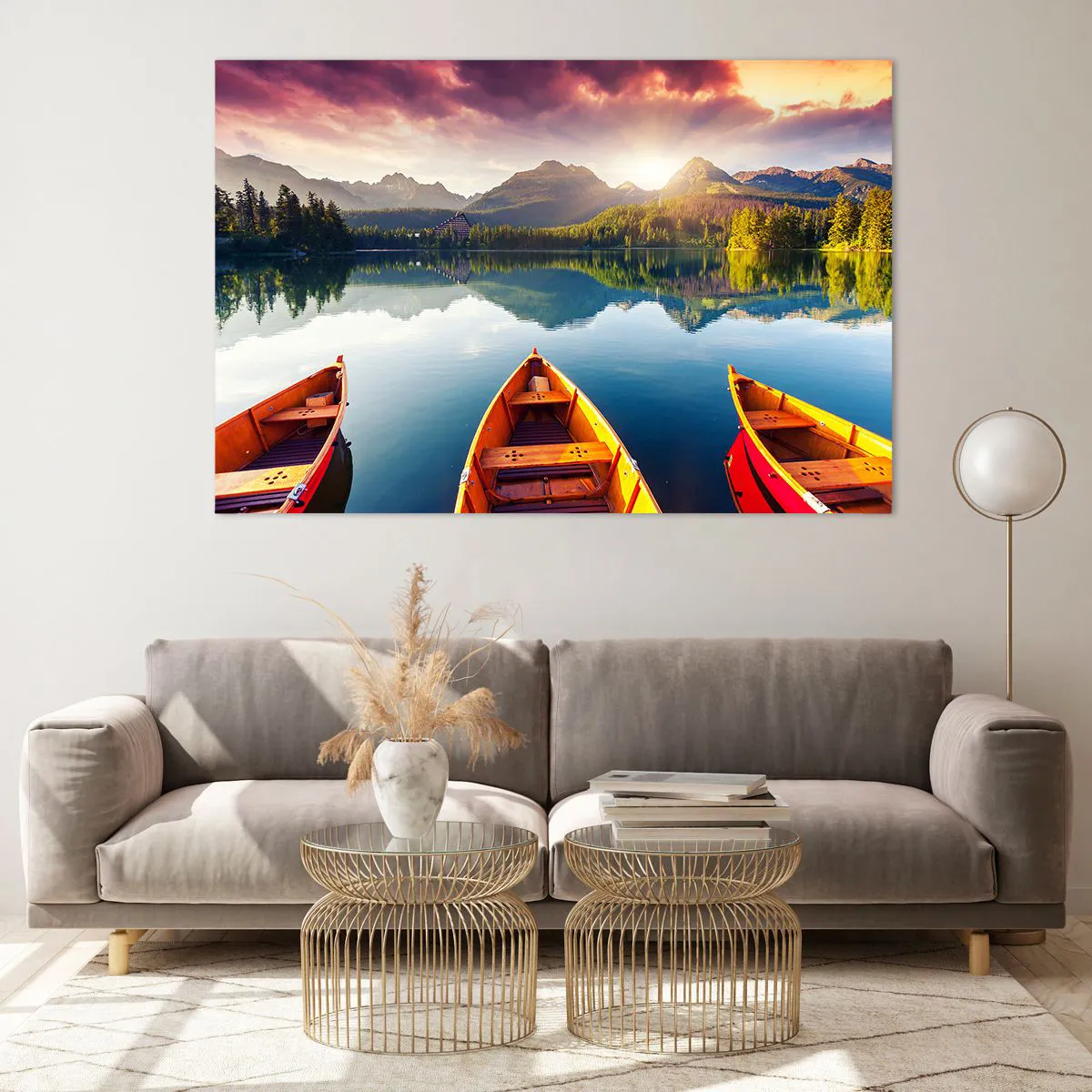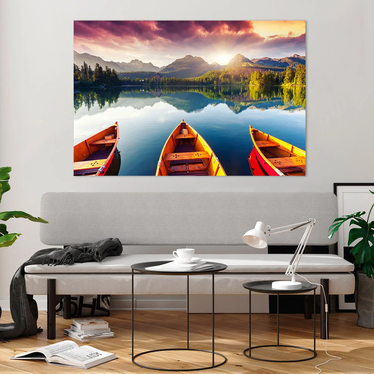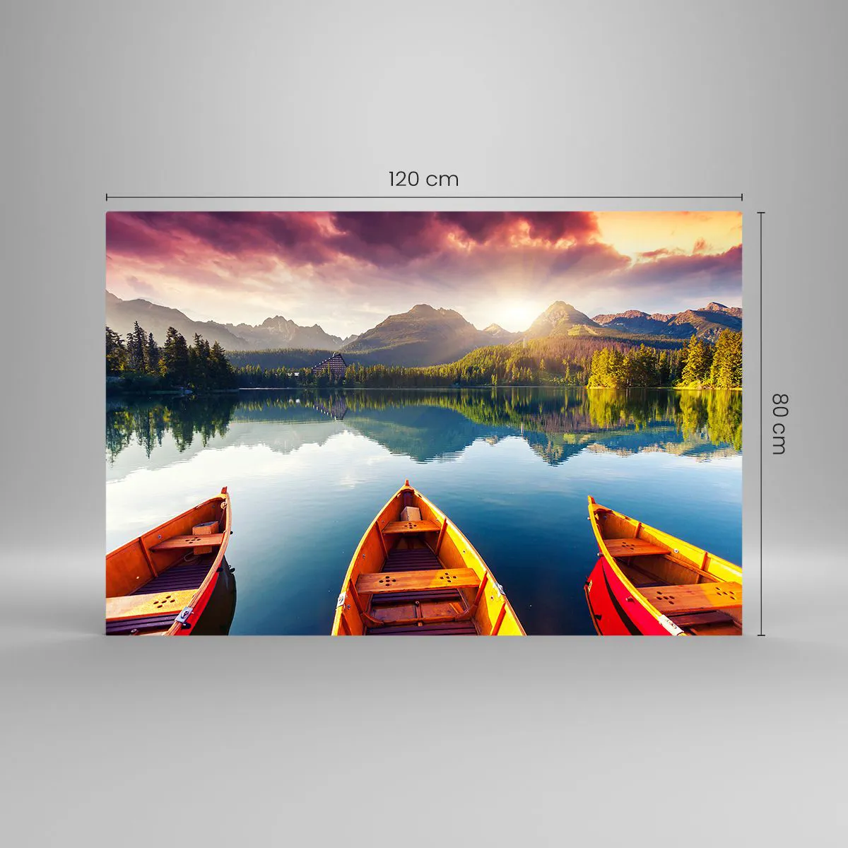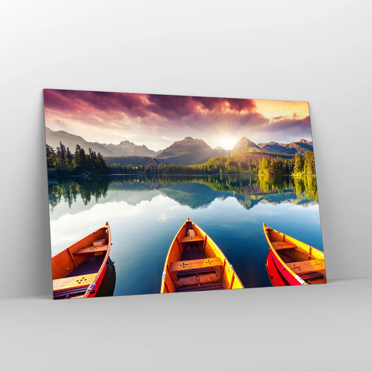 Obraz na szkle - Trzy drewniane łodzie na jeziorze z widokiem na góry o zachodzie słońca - 120x80cm - Nic przeciw naturze - Nowoczesna dekoracja ścienna do salonu, kuchni i sypialni ARTTOR