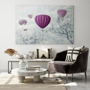 Obraz na szkle - Fioletowe balony unoszące się wśród chmur i gałęzi drzew - 120x80cm - Jak statki na niebie - Nowoczesna dekoracja ścienna do salonu, kuchni i sypialni ARTTOR