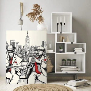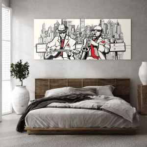 Obraz na szkle - Jazzowy duet z saksofonem i gitarą na tle miasta - 70x100cm - Nowojorska improwizacja - Nowoczesna dekoracja ścienna do salonu i sypialni ARTTOR