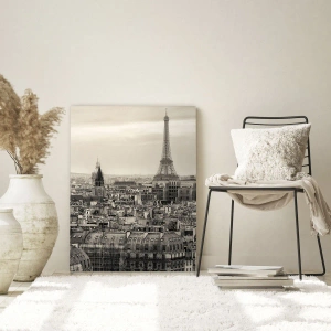 Obraz na szkle - Panorama Paryża z wieżą Eiffla w odcieniach sepii - 80x120cm - Nad dachami Paryża - Nowoczesna dekoracja ścienna do salonu i sypialni ARTTOR