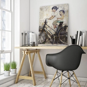 Obraz na szkle - Malowidło ścienne z rowerem i postaciami dzieci na tle muru - 50x70cm - Prawda czy fałsz? - Nowoczesna dekoracja ścienna do salonu, kuchni i sypialni ARTTOR