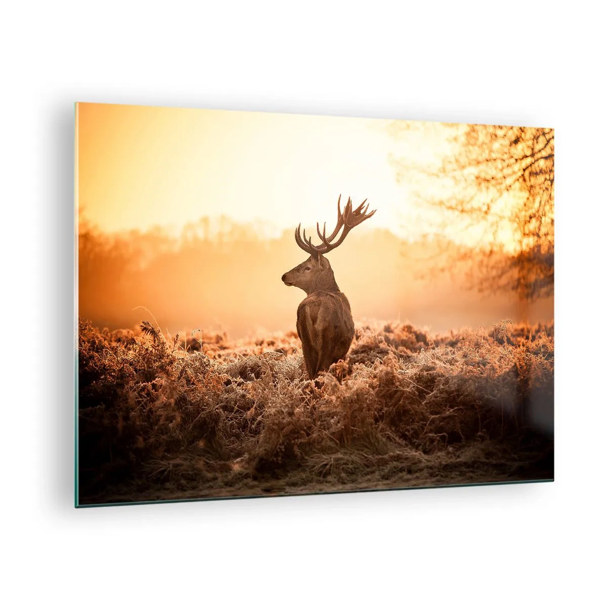 Jeleń na tle wschodu słońca w malowniczym krajobrazie to dekoracja, która wprowadza spokój i harmonię do wnętrza. Obraz wykonany na szkle o wymiarach 70x50cm wyróżnia się trwałością i elegancją.