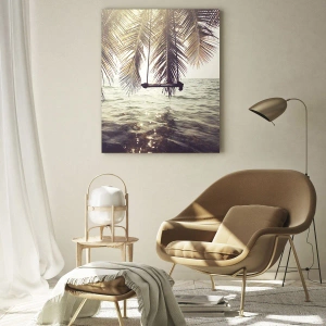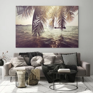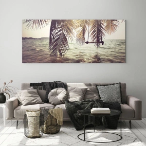 Obraz na szkle - Plaża z palmami i huśtawką nad spokojnym morzem - 50x70cm - Można bujać w obłokach do woli - Nowoczesna dekoracja ścienna do salonu, kuchni i sypialni ARTTOR