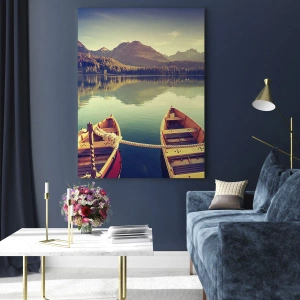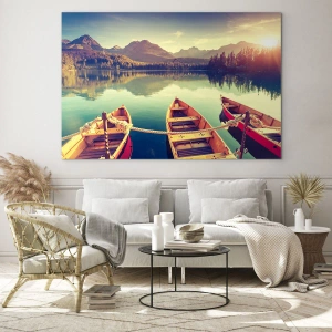 Obraz na szkle - Łódki na spokojnym jeziorze otoczonym górami o zachodzie słońca - 120x50cm - Żyć według jej praw - Nowoczesna dekoracja ścienna do salonu i sypialni ARTTOR