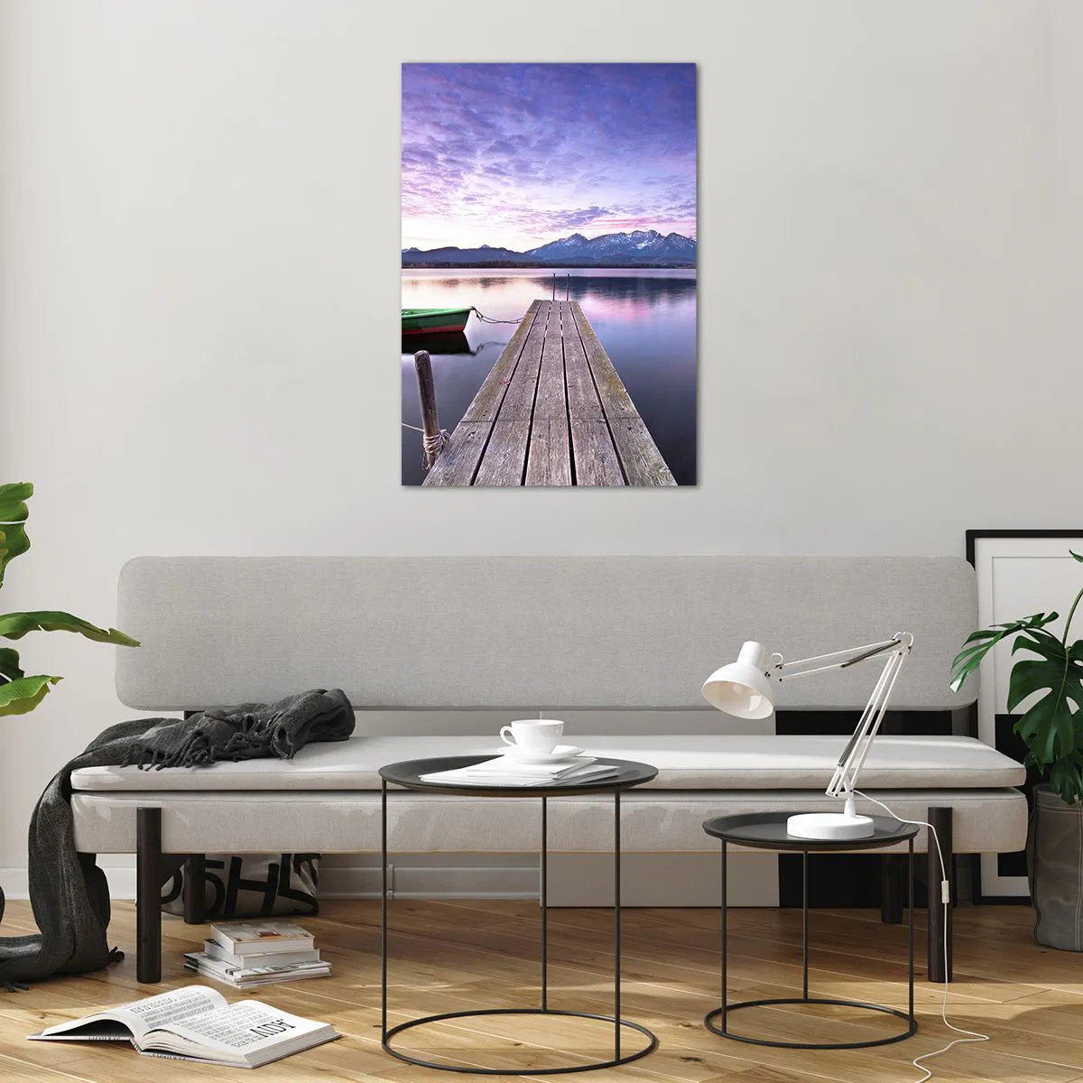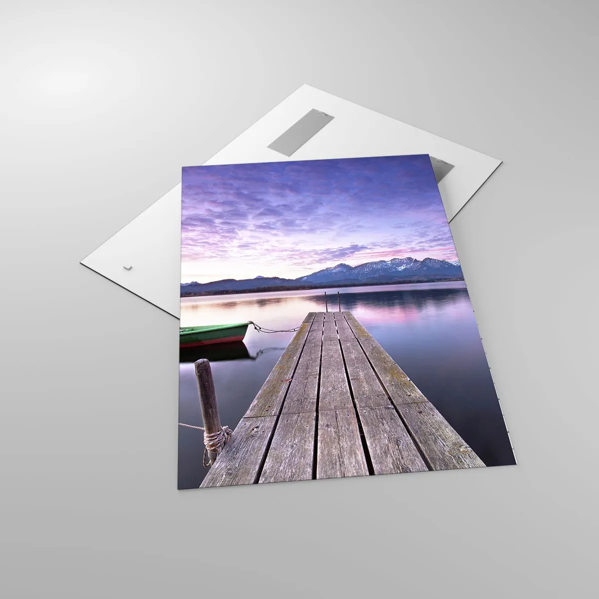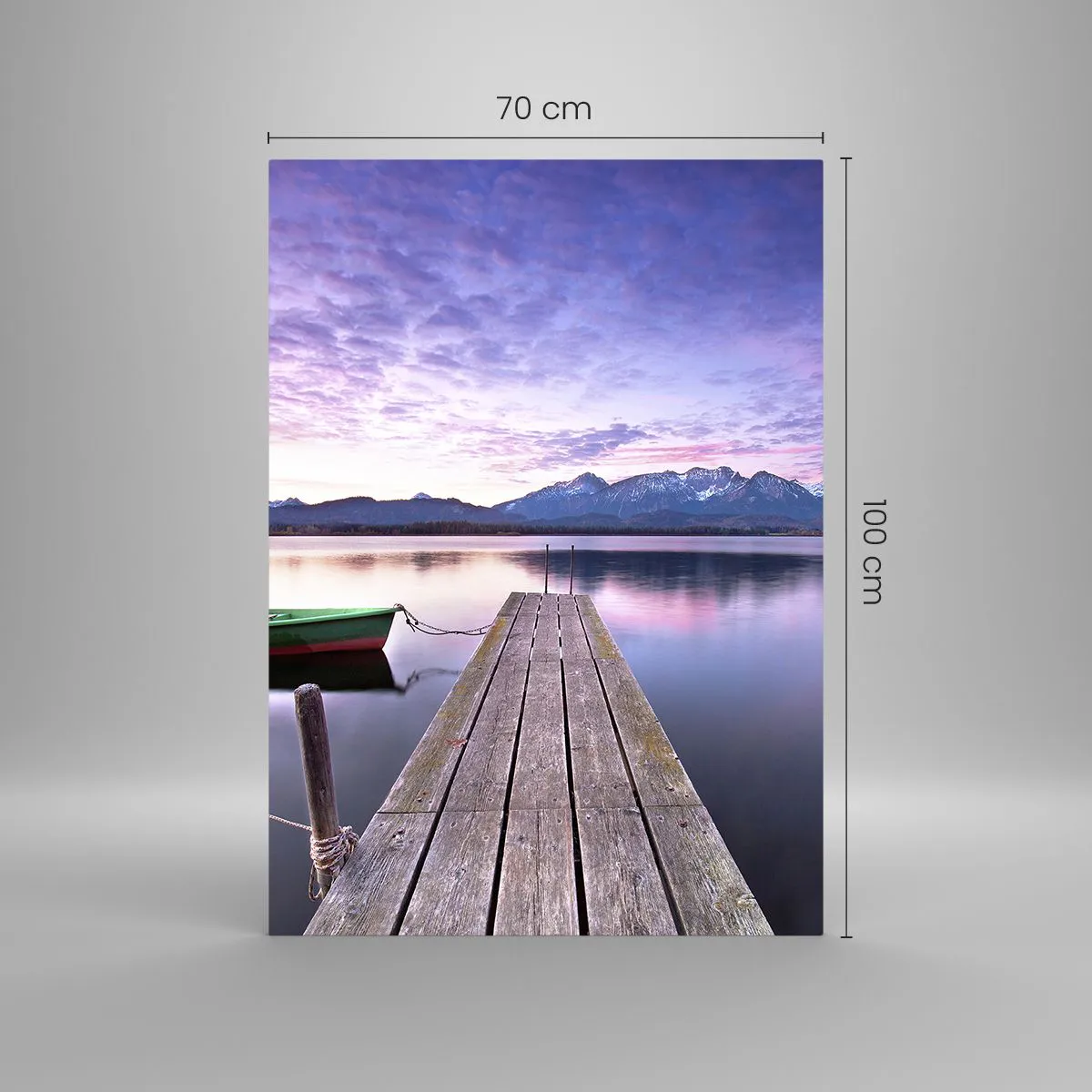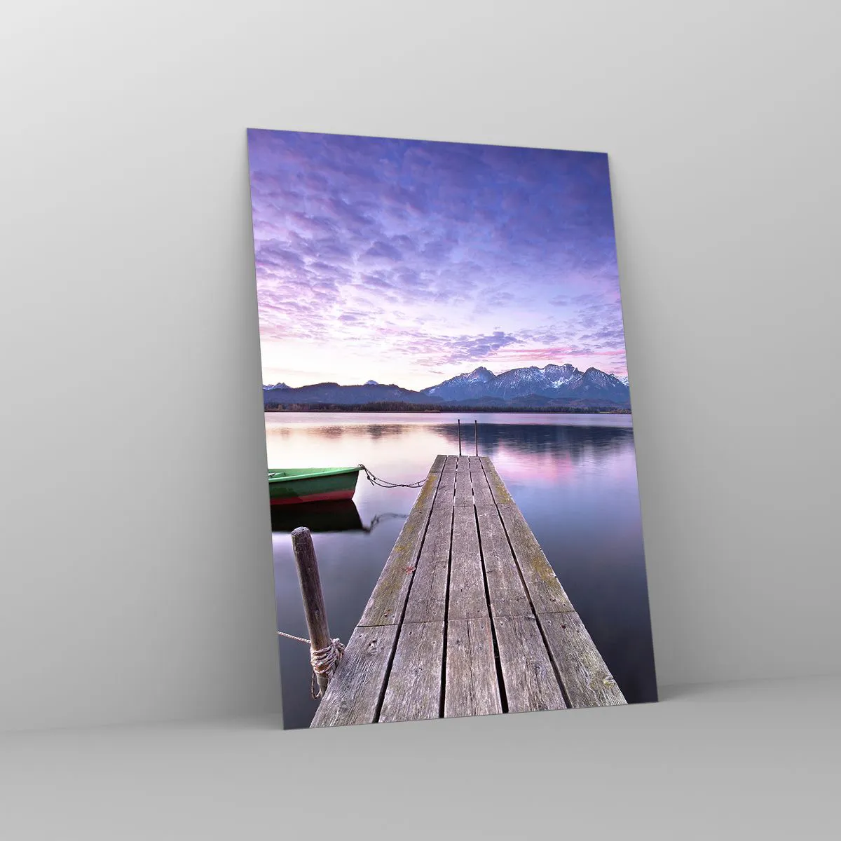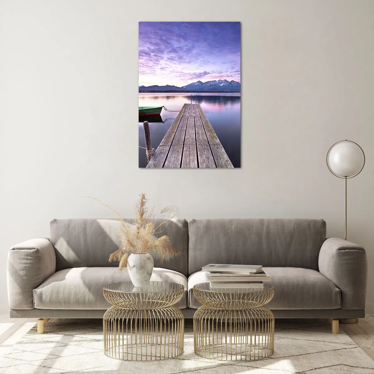 Obraz na szkle - Drewniany pomost z łódką na jeziorze otoczonym górami o zachodzie słońca - 70x100cm - Przyjazna cisza - Nowoczesna dekoracja ścienna do salonu i sypialni ARTTOR