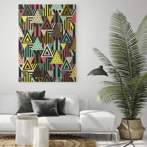 Obraz na szkle - Abstrakcyjna kompozycja z trójkątami w intensywnych kolorach - 100x70cm - W rytmie na trzy - Nowoczesna dekoracja ścienna do salonu, kuchni i sypialni ARTTOR