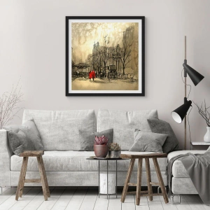 Plakat w czarnej ramie - Postać w czerwonym płaszczu na tle zimowego miasta - 50x70cm - Randka w londyńskiej mgle - Nowoczesna dekoracja ścienna do salonu i sypialni ARTTOR