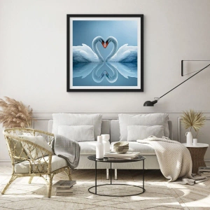 - Plakat przedstawiający dwa łabędzie tworzące kształt serca na spokojnej wodzie o błękitnym tle. Idealny do wnętrz w stylu romantycznym i eleganckim. Produkt w zestawie z czarną ramą o wymiarach 50x70 cm.