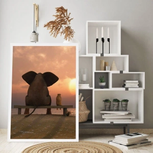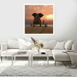 Plakat - Słoń i pies siedzą na ławce na plaży podczas zachodu słońca - 100x70cm - Dobrze jest razem pomilczeć - Nowoczesna dekoracja ścienna do salonu i sypialni ARTTOR