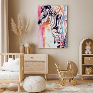 "Beztroski żart natury" to wyjątkowy obraz na płótnie o wymiarach 70x50 cm, przedstawiający kolorową zebrę na tle abstrakcyjnych, akwarelowych wzorów. Dynamiczne barwy, takie jak różowy, niebieski i żółty, łączą się z kontrastowymi czarnymi pasami, tworząc dzieło pełne energii i harmonii. Subtelne pociągnięcia farby podkreślają lekkość i artystyczny wyraz kompozycji.