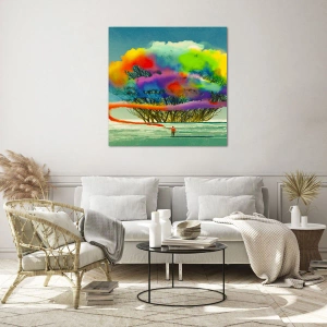 - Obraz na szkle o wymiarach 70x50 cm ukazujący kolorową eksplozję dymu otaczającą samotne drzewo na tle błękitnego nieba. Idealny do wnętrz, które pragną wyrazistych akcentów i inspiracji.