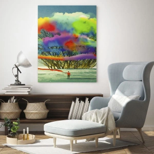"Ożywić ten świat" to wyjątkowy obraz na szkle w formacie 70x50 cm, który urzeka swoim niezwykłym połączeniem natury i artystycznej wizji. Kompozycja przedstawia samotne drzewo, otulone wielobarwną eksplozją dymu, rozprzestrzeniającego się na tle spokojnego błękitnego nieba. Dynamiczna gra kolorów, takich jak czerwień, żółć, zieleń, fiolet i błękit, tworzy wyjątkową harmonię i przyciąga wzrok.