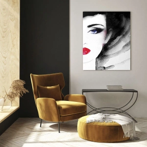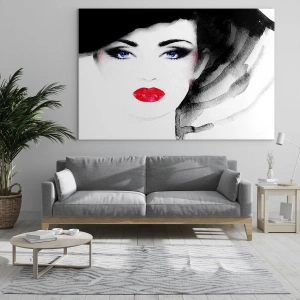 Obraz na szkle - Portret kobiety z czerwonymi ustami i intensywnymi niebieskimi oczami - 160x50cm - Odpycha i przyzywa - Nowoczesna dekoracja ścienna do salonu i sypialni ARTTOR