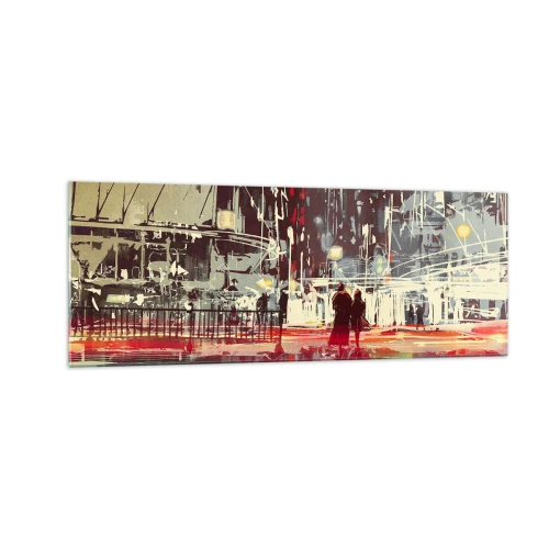 Obraz na szkle - Miasto nocą z neonami i sylwetkami ludzi na ulicy - 140x50cm - Wielkomiejska przeprawa - Nowoczesna dekoracja ścienna do salonu i sypialni ARTTOR