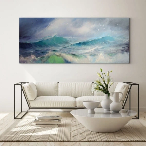 Detale obrazu, takie jak migoczące fale i turkusowe odcienie wody, przyciągają uwagę i wprowadzają do wnętrza atmosferę nieokiełznanej przyrody. Kompozycja jest jednocześnie dramatyczna i harmonijna, co sprawia, że idealnie pasuje do przestrzeni w stylu nowoczesnym, klasycznym czy industrialnym.