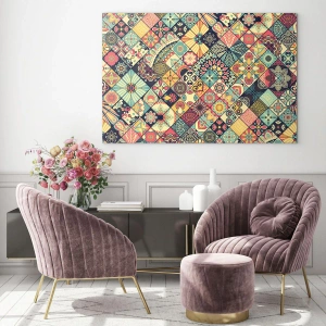 Marokańskie klimaty to obraz, który wprowadza do wnętrz wyjątkową atmosferę inspirowaną orientalnym stylem i kulturą wschodu. Kolorowe geometryczne motywy, przypominające tradycyjne marokańskie wzory, tworzą harmonijną i złożoną kompozycję.