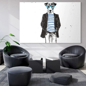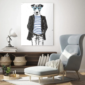 Obraz na szkle - Ilustracja psa w marynarskiej koszulce i okularach na białym tle - 50x70cm - Na psa urok - Nowoczesna dekoracja ścienna do salonu, kuchni i sypialni ARTTOR