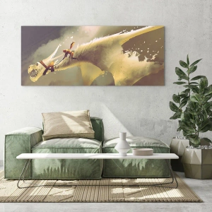 Obraz na szkle - Postać na grzbiecie białego smoka w mglistym krajobrazie - 120x80cm - Światu na ratunek - Nowoczesna dekoracja ścienna do salonu, kuchni i sypialni ARTTOR