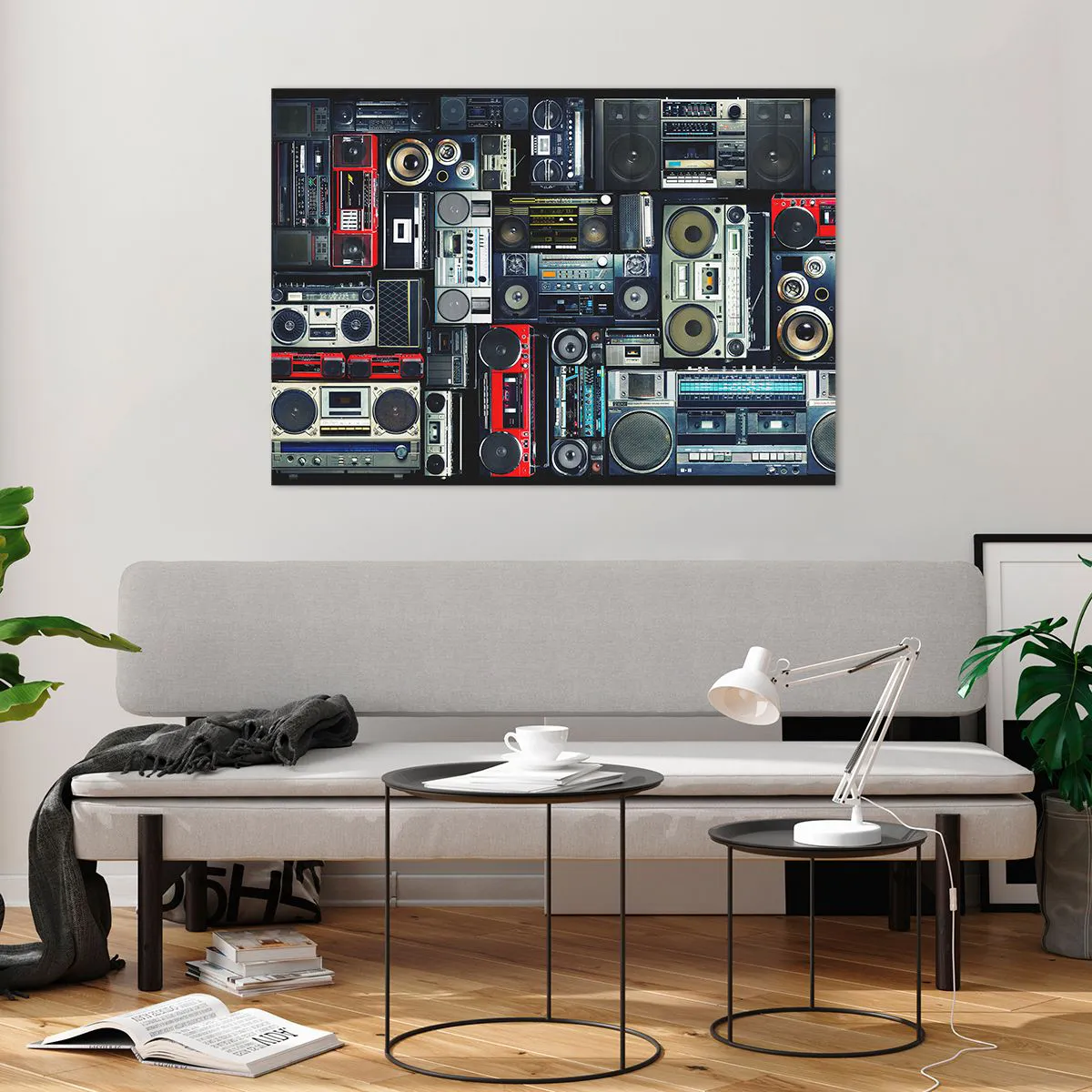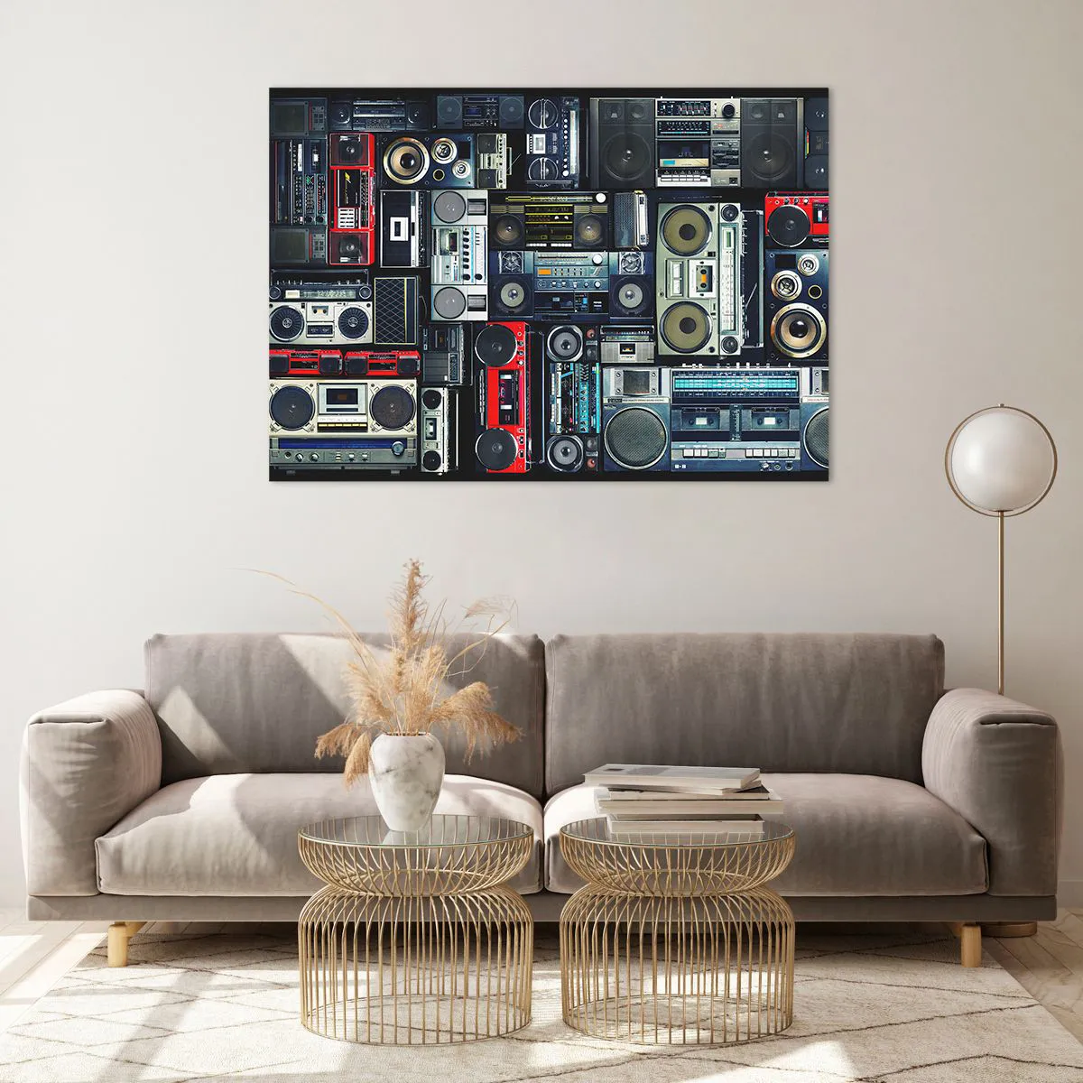Obraz na szkle - Kolaż retro radioodbiorników i magnetofonów na ciemnym tle - 100x70cm - Tęsknota za latami 80. - Nowoczesna dekoracja ścienna do salonu, kuchni i sypialni ARTTOR