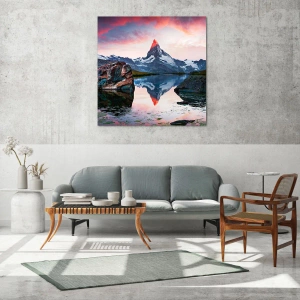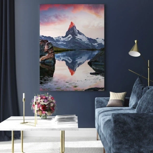 Obraz na szkle - Górski szczyt odbijający się w jeziorze o zachodzie słońca - 70x100cm - Serce gór jest gorące - Nowoczesna dekoracja ścienna do salonu i sypialni ARTTOR