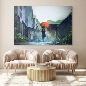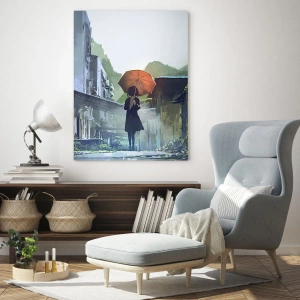 Detale obrazu, takie jak krople deszczu, wilgotne ulice i otaczające budynki, nadają mu autentyczności i malowniczego uroku. Zielona roślinność w tle kontrastuje z ciepłym akcentem parasola, dodając kompozycji harmonii i głębi. To idealne połączenie natury i miejskiego krajobrazu w artystycznym wydaniu.