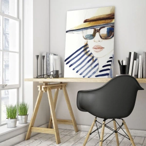 Obraz na szkle - Stylowa kobieta w kapeluszu i okularach w akwarelowym stylu - 50x70cm - Floryda wita! - Nowoczesna dekoracja ścienna do salonu, kuchni i sypialni ARTTOR