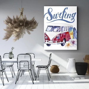 - Stylowa grafika z czerwonym retro busem, deskami surfingowymi i tropikalnymi kwiatami. Idealna dekoracja dla miłośników surfingu i podróży, wprowadzająca wakacyjny klimat do wnętrz.
