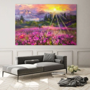Obraz na szkle - Malownicza dolina pełna kwiatów oświetlona promieniami słońca - 100x70cm - W dolinie pod opieką słońca - Nowoczesna dekoracja ścienna do salonu, kuchni i sypialni ARTTOR