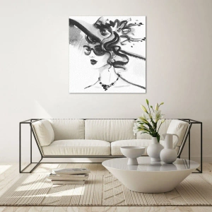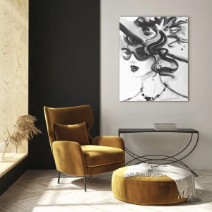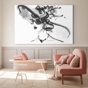 Obraz na szkle - Elegancka kobieta w kapeluszu w czarno-białym stylu - 80x120cm - Dama z charakterem - Nowoczesna dekoracja ścienna do salonu i sypialni ARTTOR
