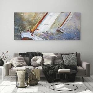 Obraz na szkle - Żaglówki na wzburzonych falach w dynamicznej kompozycji - 140x50cm - Biegnące po falach - Nowoczesna dekoracja ścienna do salonu i sypialni ARTTOR