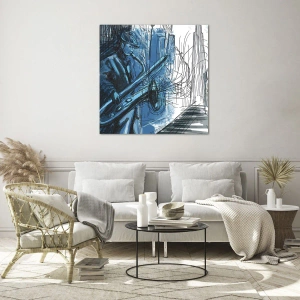 Obraz na ścianę "Miejska rapsodia" to wyjątkowe dzieło artystyczne, które łączy jazzowy klimat z miejską scenerią. Głównym motywem jest sylwetka saksofonisty, która wyłania się z tła przedstawiającego ulice miasta. Utrzymana w odcieniach niebieskiego kolorystyka nadaje obrazowi melancholijnego i klimatycznego charakteru.
