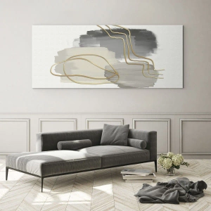 Obraz na szkle - Abstrakcja z szarymi plamami i złotymi liniami na jasnym tle - 50x70cm - Trwanie i ruch - Nowoczesna dekoracja ścienna do salonu, kuchni i sypialni ARTTOR