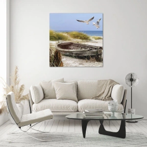 "Skąpane wiatrem" to niezwykły obraz na szkle o wymiarach 70x50 cm, przedstawiający starą drewnianą łódź na piaszczystej plaży z mewami w locie. Scena pełna spokoju i harmonii, która oddaje piękno nadmorskiego krajobrazu.