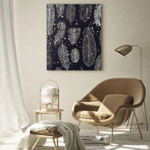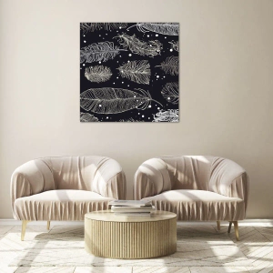 - Grafika przedstawiająca delikatne białe pióra na czarnym tle. Minimalistyczny i elegancki design, idealny do nowoczesnych wnętrz o subtelnym i wyrafinowanym charakterze.