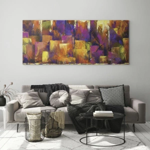 - Szklany obraz o wymiarach 70x50 cm przedstawia abstrakcyjną wizję metropolii w ciepłych barwach, wzbogaconą akcentami fioletu, które tworzą niepowtarzalny klimat.