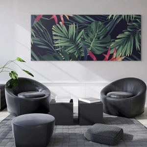 Obraz na szkle - Egzotyczne liście i kwiaty na ciemnym tle - 70x50cm - Zapłonąć w zieleni - Nowoczesna dekoracja ścienna do salonu i sypialni ARTTOR