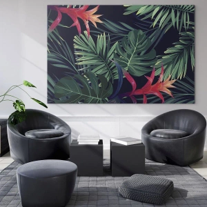 - Stylowy obraz przedstawiający tropikalne liście i egzotyczne kwiaty na ciemnym tle. Nowoczesny design łączący harmonię natury z dekoracyjnym akcentem.