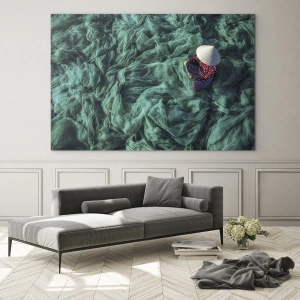 Obraz na szkle - Kobieta w tradycyjnym kapeluszu naprawiająca sieci - 120x80cm - W morzu sieci - Nowoczesna dekoracja ścienna do salonu, kuchni i sypialni ARTTOR