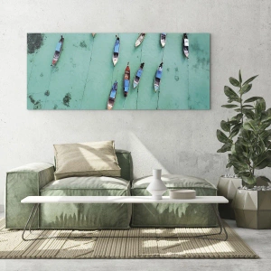 Obraz na szkle - Łodzie na turkusowej wodzie widziane z góry - 100x70cm - W radosnym oczekiwaniu - Nowoczesna dekoracja ścienna do salonu, kuchni i sypialni ARTTOR