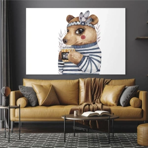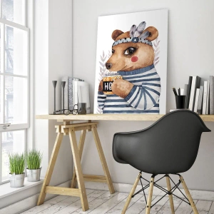 Obraz na szkle - Miś w pasiastym sweterku z kubkiem miodu - 80x120cm - Słodka Misia - Nowoczesna dekoracja ścienna do salonu i sypialni ARTTOR