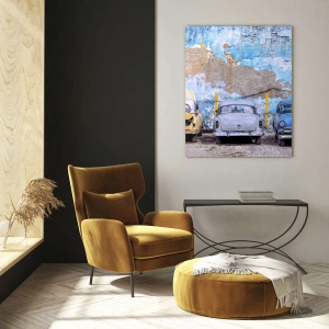 Obraz na szkle - Zabytkowe samochody na tle zniszczonego muru - 50x70cm - Spotkanie weteranów - Nowoczesna dekoracja ścienna do salonu, kuchni i sypialni ARTTOR