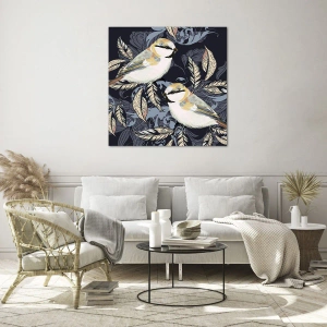 Obraz na szkle - Ilustracja dwóch ptaków na ciemnym tle z ornamentami - 120x80cm - Żółto-błękitny trel - Nowoczesna dekoracja ścienna do salonu, kuchni i sypialni ARTTOR