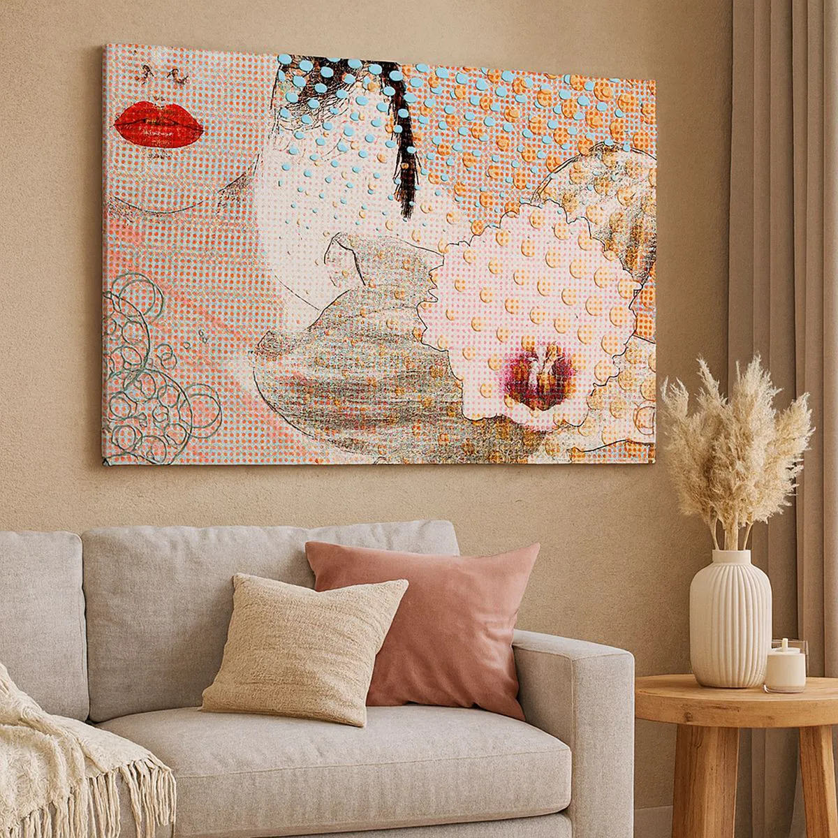 Ten obraz to doskonały wybór dla osób, które cenią oryginalność i wyraziste dekoracje. Świetnie sprawdzi się w salonie, gabinecie czy przestrzeniach kreatywnych, dodając wnętrzom wyrafinowania i unikalnego charakteru. Motywy ust i orchidei podkreślają indywidualność obrazu, jednocześnie wprowadzając do wnętrza atmosferę harmonii i piękna.