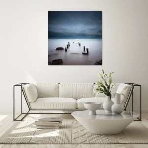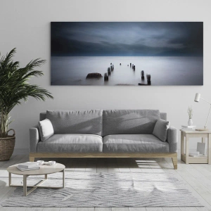 - Hipnotyzujący obraz przedstawiający spokojne morze z drewnianymi palami wynurzającymi się z wody. Subtelna mgła i ciemne chmury nadają scenie tajemniczy, melancholijny charakter. Idealna dekoracja do wnętrz w nowoczesnym stylu.