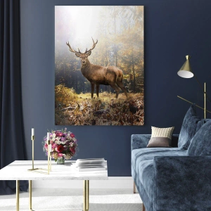 Obraz na szkle - Jeleń w jesiennym lesie z promieniami słońca - 70x100cm - W pełnym majestacie - Nowoczesna dekoracja ścienna do salonu i sypialni ARTTOR