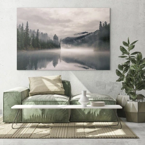 Obraz na szkle - Poranny widok na jezioro w lesie, otulone mgłą - 50x70cm - W zadumie, we mgle - Nowoczesna dekoracja ścienna do salonu, kuchni i sypialni ARTTOR