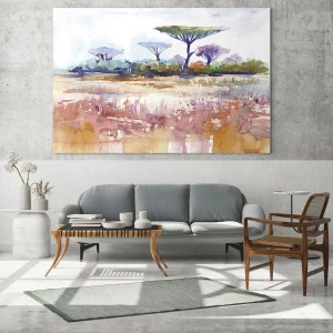 Obraz na szkle - Akwarelowy krajobraz sawanny z drzewami i roślinnością - 50x70cm - Kolory sawanny - Nowoczesna dekoracja ścienna do salonu, kuchni i sypialni ARTTOR