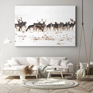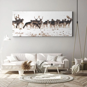 Obraz na płótnie - Stado jeleni na śnieżnym tle - 120x80cm - Idą święta? - Nowoczesna dekoracja ścienna do salonu, kuchni i sypialni ARTTOR