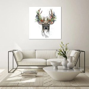 Obraz na szkle - Stylizowany jeleń z ozdobnym porożem na białym tle - 80x120cm - W świątecznej szacie - Nowoczesna dekoracja ścienna do salonu i sypialni ARTTOR