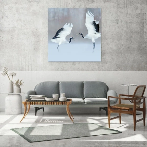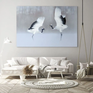 Obraz na szkle - Dwa żurawie tańczące w mglistej scenerii - 80x120cm - Taniec we mgle - Nowoczesna dekoracja ścienna do salonu i sypialni ARTTOR